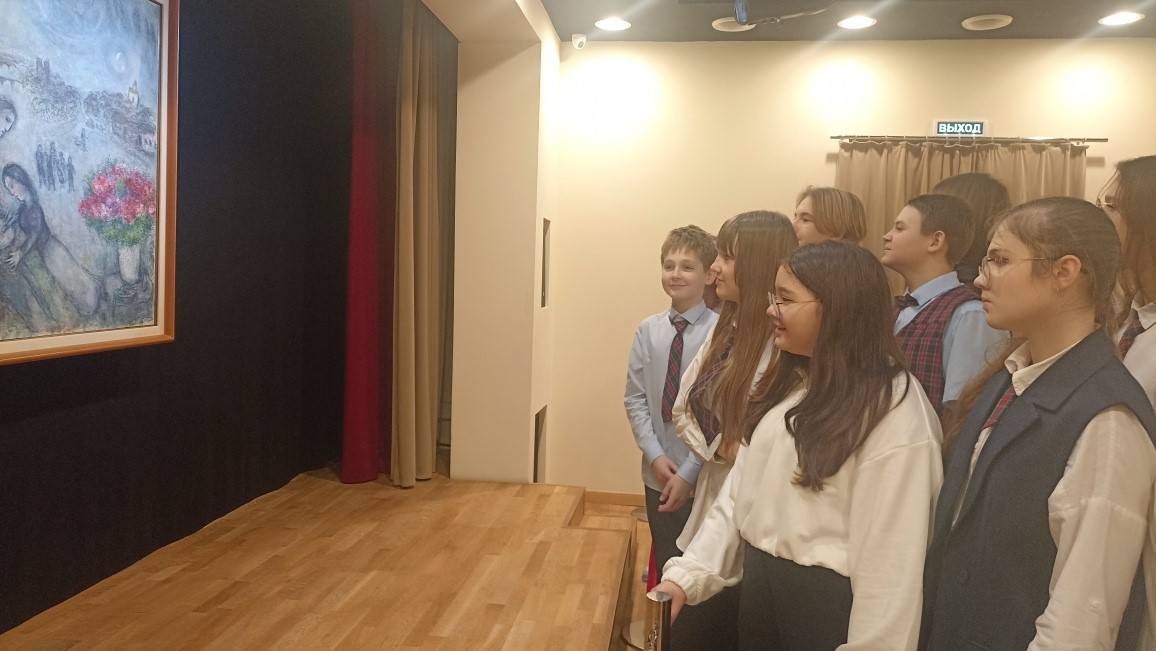 21 ноября, в рамках проекта «Культурная суббота» учащиеся 7В1 класса посетили Музей одной картины, где выставляется шедевр Марка Шагала «Художник и его невеста» из Государственного музея изобразительных искусств имени А.С. Пушкина.